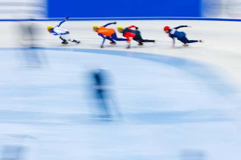 Mladá Boleslav se stala pořadatelským městem mistrovství Evropy v short tracku pro rok 2012. Po tři dny se závodilo na zimním stadionu ve štafetě družstev a o individuální medaile ve čtyřboji. Já jsem měl čas fotit dva dny. Nejatraktivnější mi přišly semifinalové jízdy, zejména závěrečná kola, kdy se rozhodovalo o postupu do finále a závodníci byli draví. Světla bylo méně než na extraligový hokej, led byl udělaný čistý bez reklam. Výhody akreditovaných fotografů od běžných příchozích byly zanedbatelné. Zafotit si tu mohl bez problémů každý. Trochu mě zklamalo vlažné chování vítězů. Zřejmě jsou zvyklí na cennější medaile.